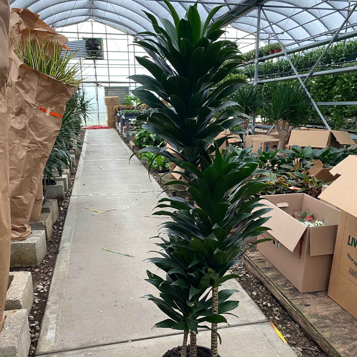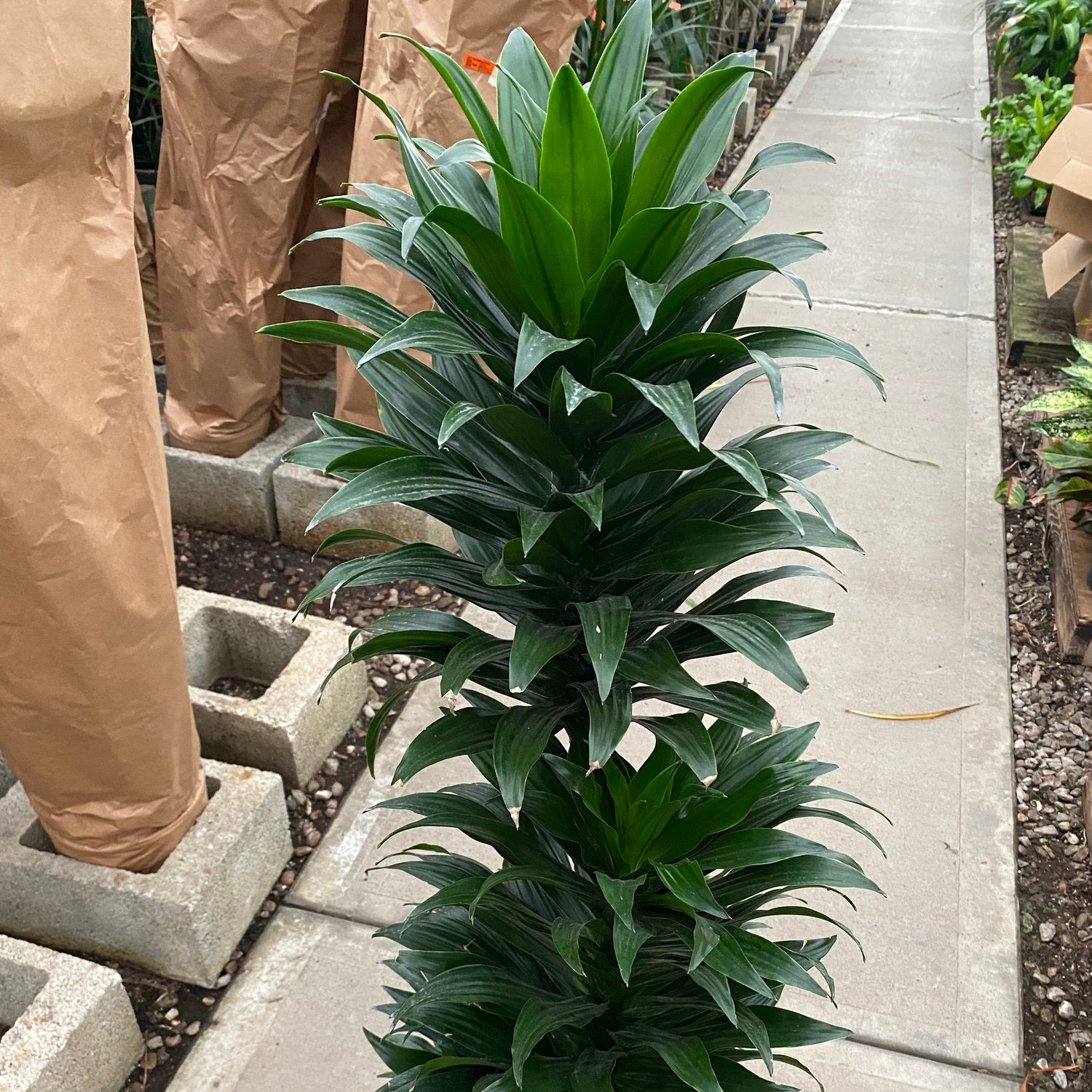 Dracaena Janet Craig Compacta is a striking member of the dracaena family, prized for its distinctive cane-like stems and elegant, wavy foliage that brings architectural interest to any space. This corn plant thrives in lower to bright, indirect light conditions. Water thoroughly every two weeks using approximately 16oz per watering. Best suited for 10" or 12" planters—if using a container without drainage, add 1" of pea gravel at the base. Standing approximately 4.5 feet tall at maturity, this specimen makes a bold statement piece. Note: not suitable for homes with pets. Each plant arrives with a comprehensive care guide to support your success as a plant parent.