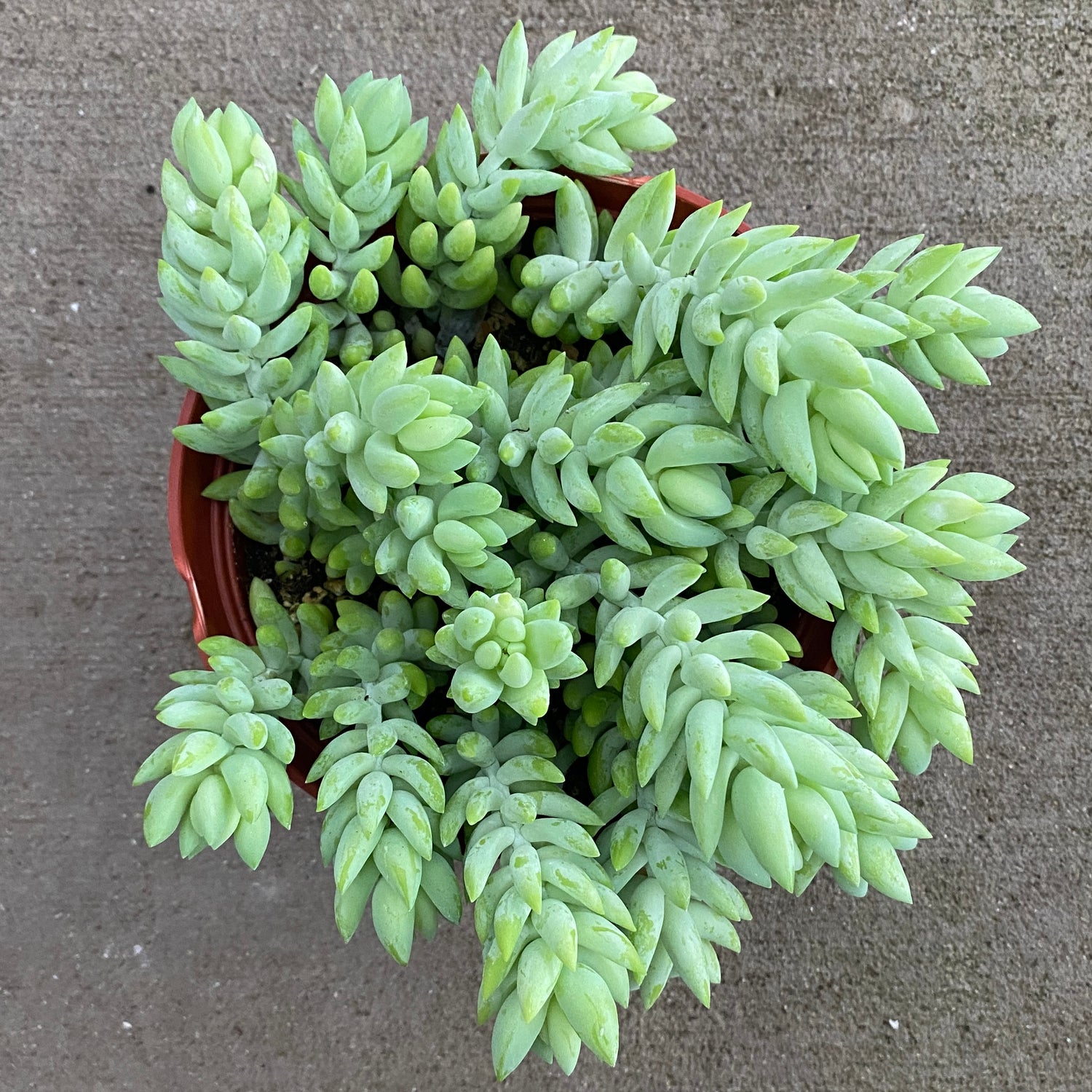 the burro tail is known for trailing, densely-packed stems, which can grow up to 24" long and are covered in fleshy, tear-drop-shaped blue-green leaves. water once every two weeks. water 1/2 of a 16oz water bottle. bright, indirect light. pet friendly. plant in a 6" planter. if the planter does not have a drain hole, line the planter with a 1" of pea gravel before potting. each plant will come with a plant parent care card.