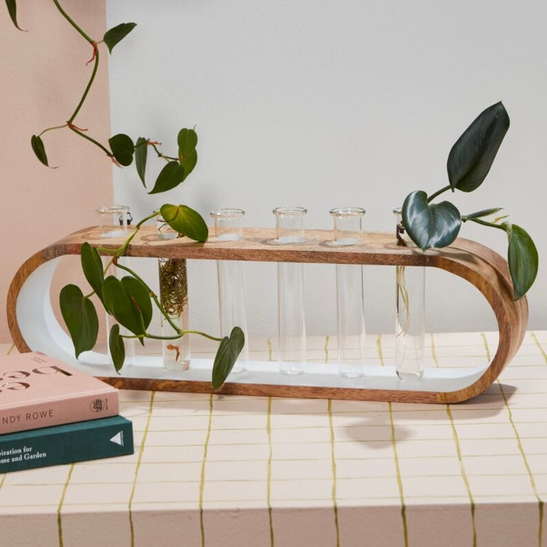 the kennedy propagation stand features modern light mango wood with wall mounts, with a fresh white interior and test tubes for propagating all your plants in style. can be hung or placed on tabletop.